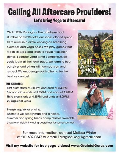 To register your child for a class, please click on the "Pay For Your Class" tab above and select your school. Once you have paid for your class, please be sure to download the PDF registration form and email it to Melissa Winter at 1MagicalYogi@gmail.com or text it to her at (201) 602-0547. Your registration form must be on file prior to starting your first class.